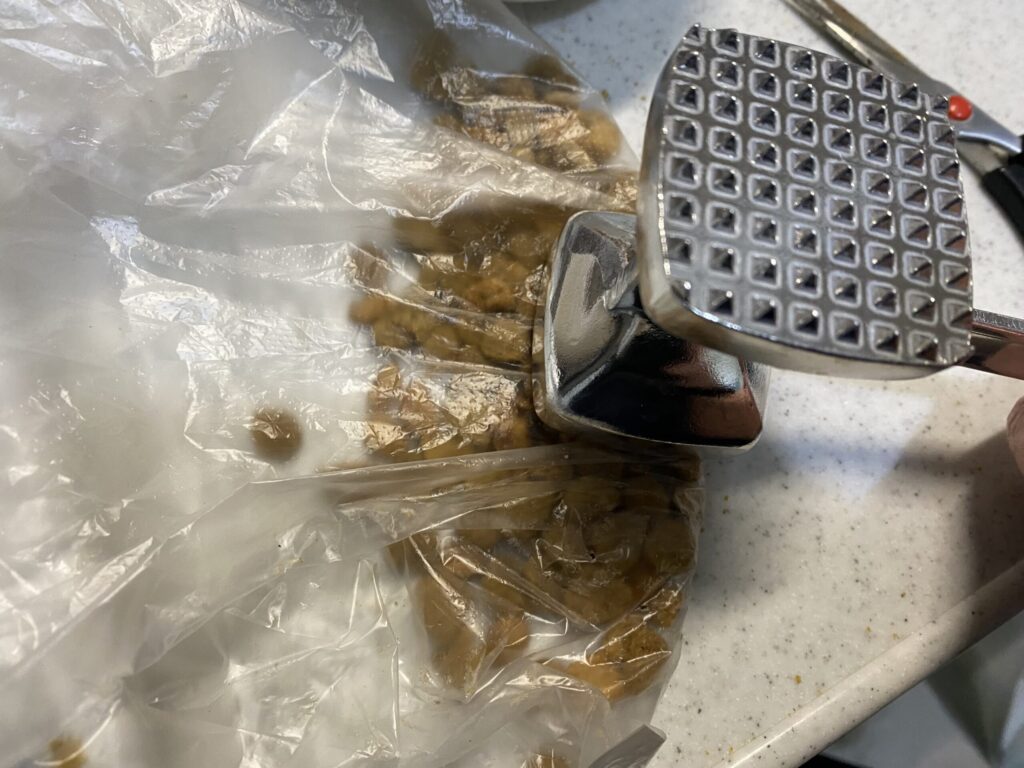 ビニール袋に入れて肉叩きハンマーで叩きます