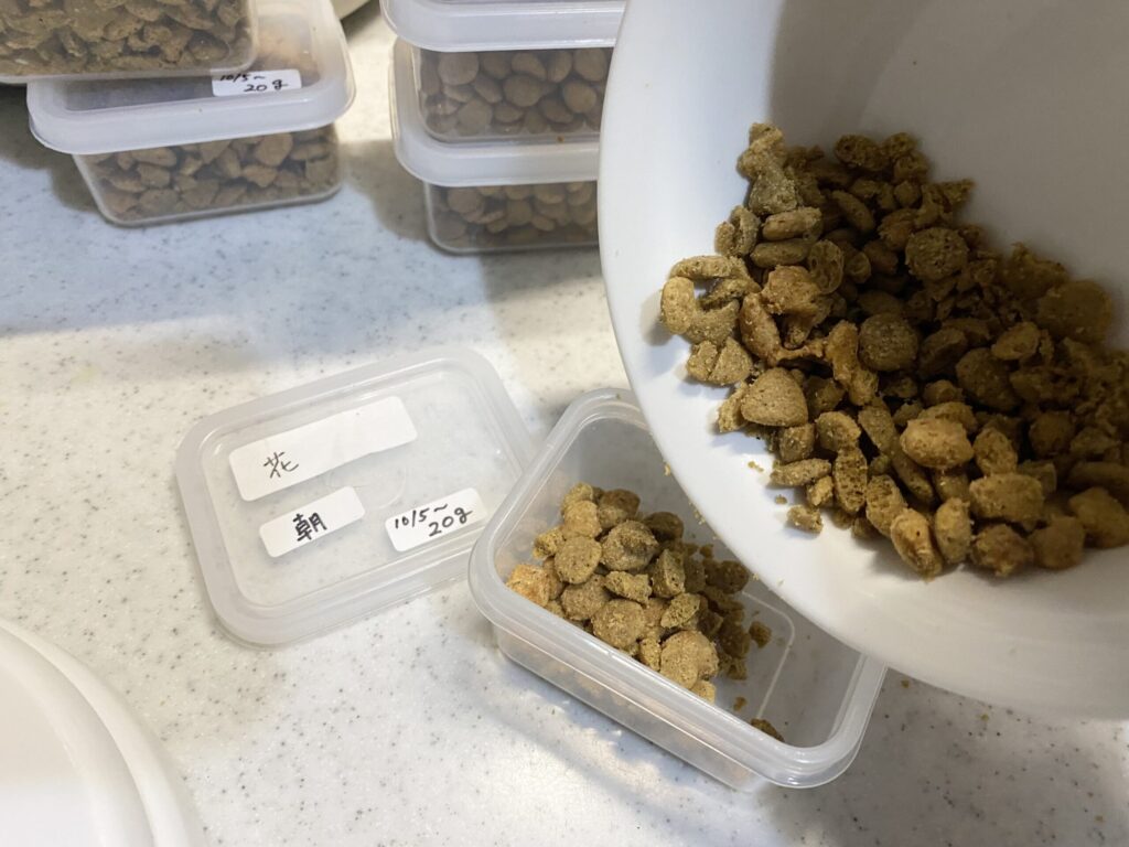 まずは花ちゃんの1回の量を測ります。1日40gなので20g。